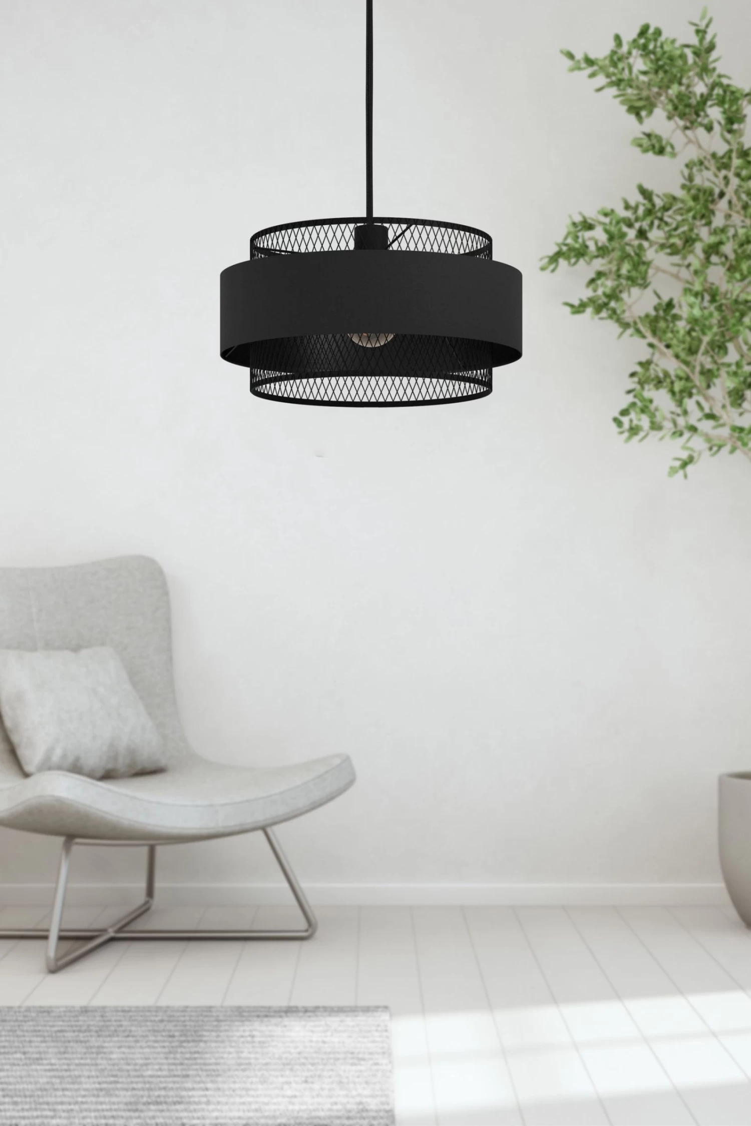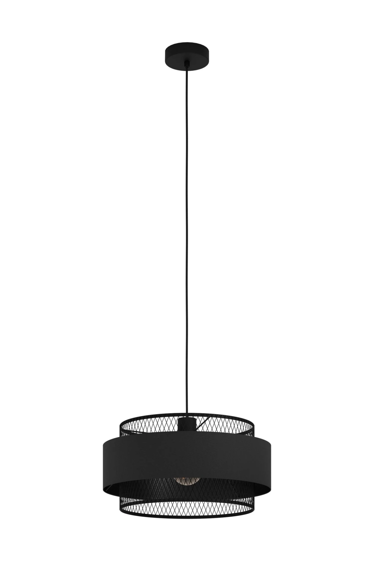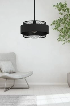 The Bazely is a stunning single pendant light with a sleek all-black finish. The product has a circular black steel ceiling rose and textile cable. The lampshade has a mesh-style drum shade with an outer black fabric strip. With this combination of textures and textiles, the product is a chic choice for interior lighting and would compliment a range of rooms from the bedroom to the living room. This light is IP20 rated, suitable for interior use only. Standard 2 year warranty.n