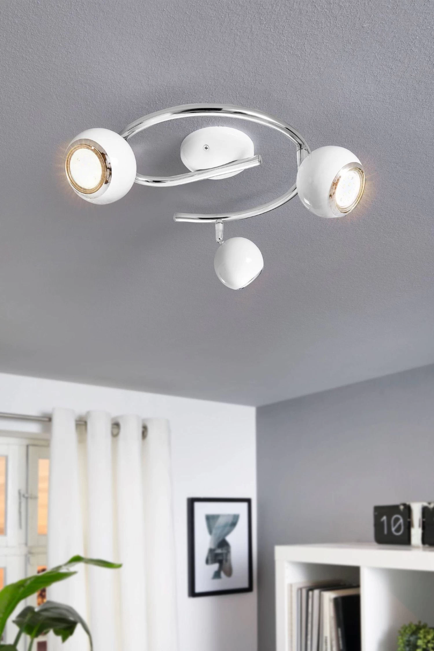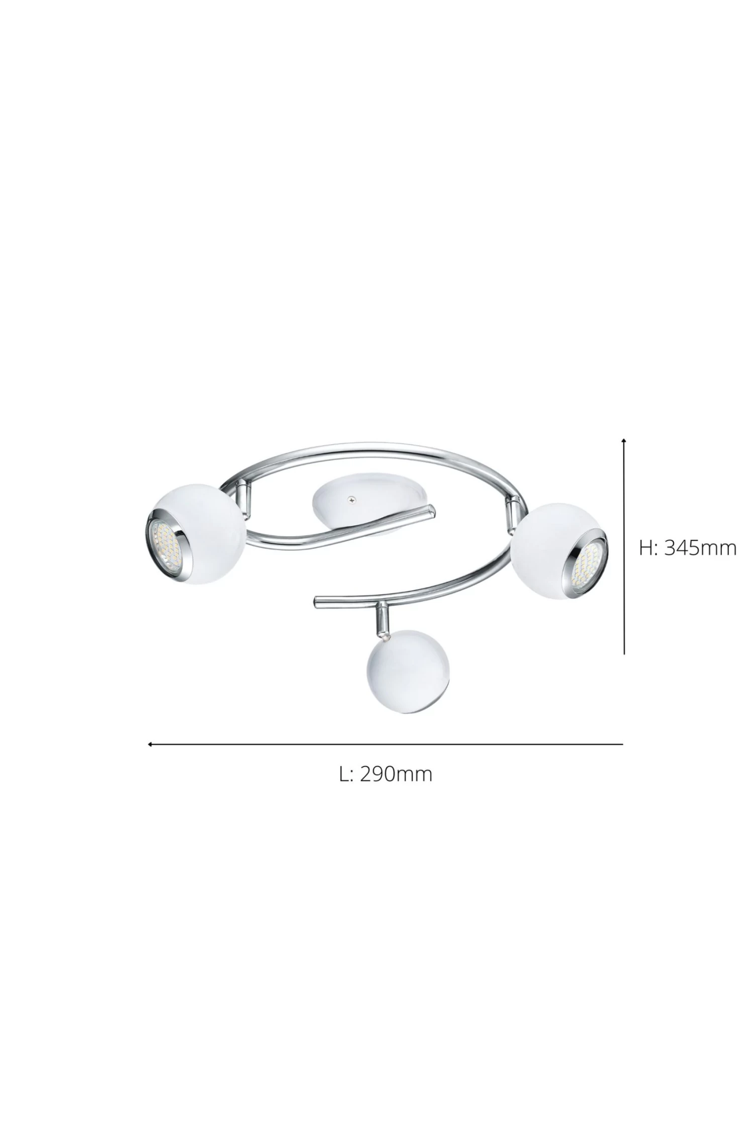 Ultra-modern design with a polished chrome finish, the Bimeda features a spiral design and three adjustable spotlight heads in white steel. The product includes GU10-LED lightbulbs that produce a warm white light when illuminated and promote energy efficiency and cost-saving capabilities. The Bimeda is a modern ceiling light, perfect for a contemporary home with its spotlight design and sleek metal finish.
