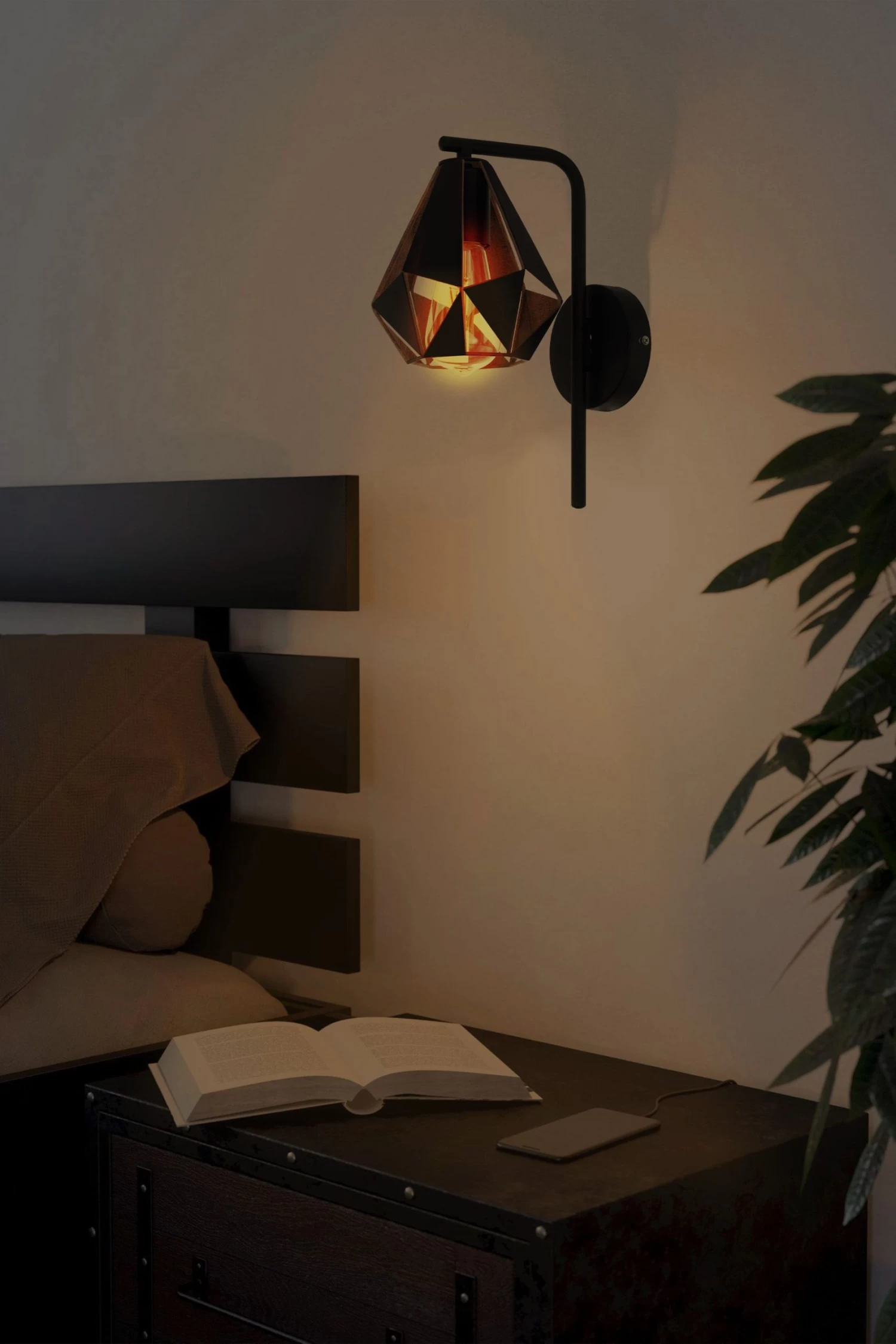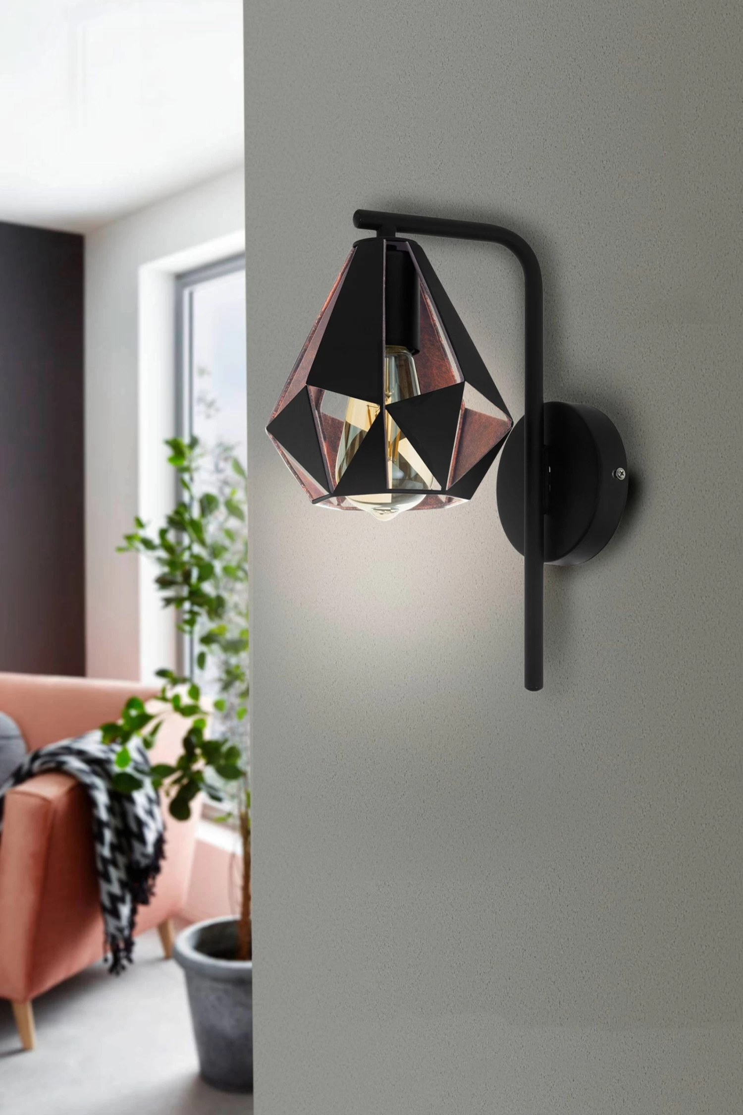 Drawing from vintage influences with a circular base and thin stem, the Carlton 4 wall lamp features an angled shade with geometric design in contrasting black and copper steel. Perfect to add a softer illumination to your interior, the Carlton 4 requires 1 x E27 illuminant and would complement contemporary or rustic interior alike. This light is IP20 rated, suitable for interior use only. Standard 2 year warranty.