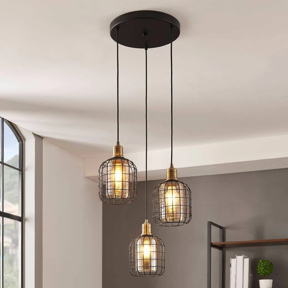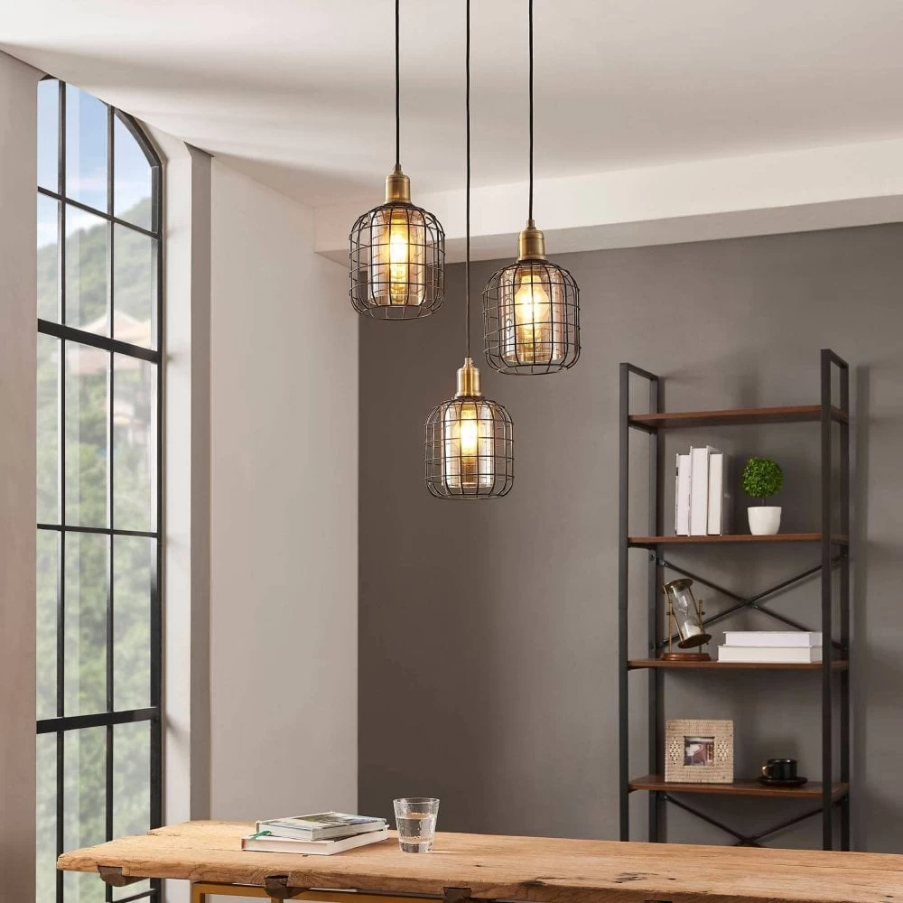 The CHISLE pendant light features three black wire lampshades with amber-coated glass inner shades. Each shade is suspended at a different height from the black metal canopy. When the light is on, the caged design creates a fascinating play of light and shadow when illuminated. The combination of elegant glass and rustic metal complements modern loft-style interiors. The product creates statement lighting in any space, whether in the living room or above the dining room table