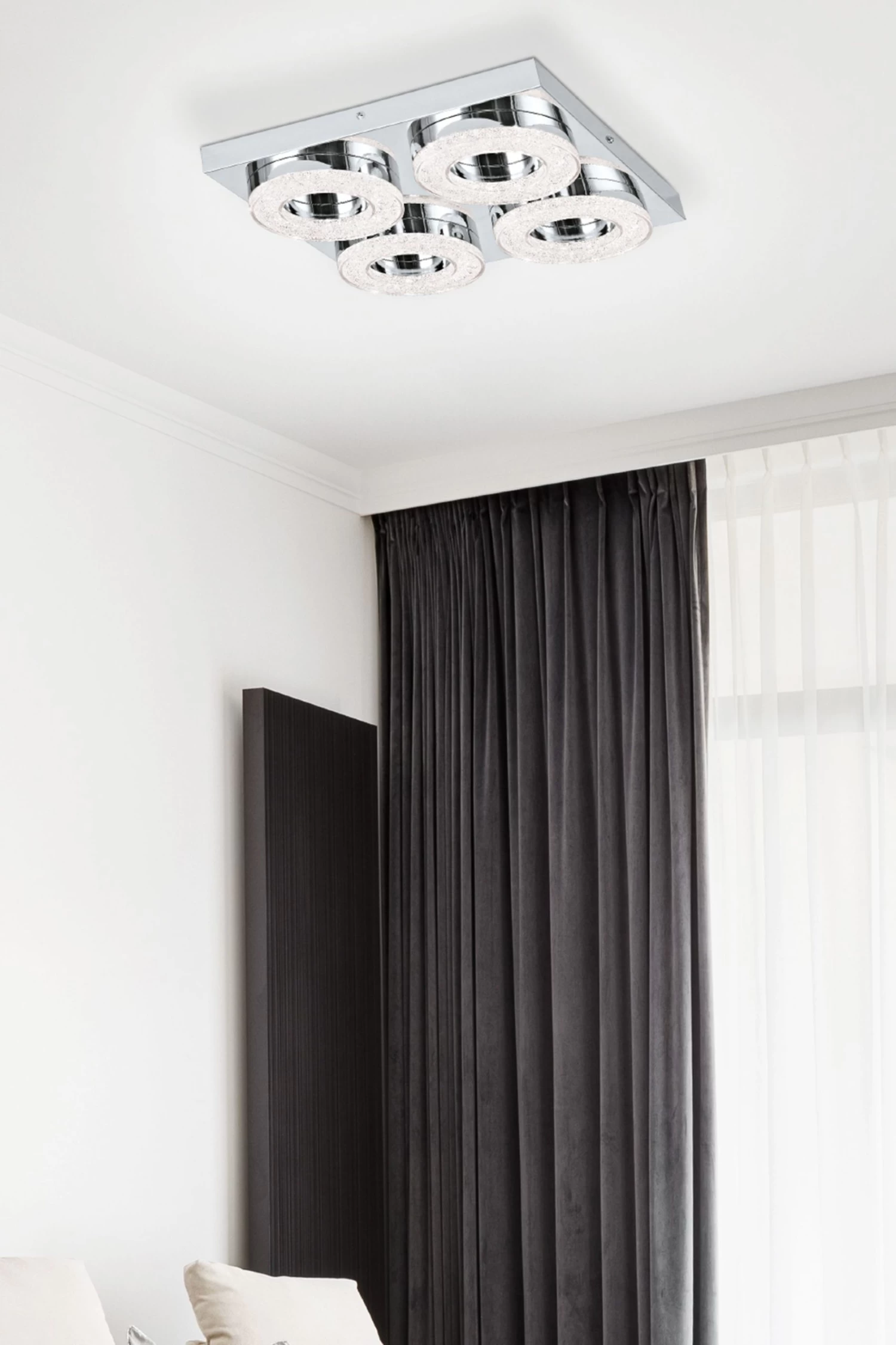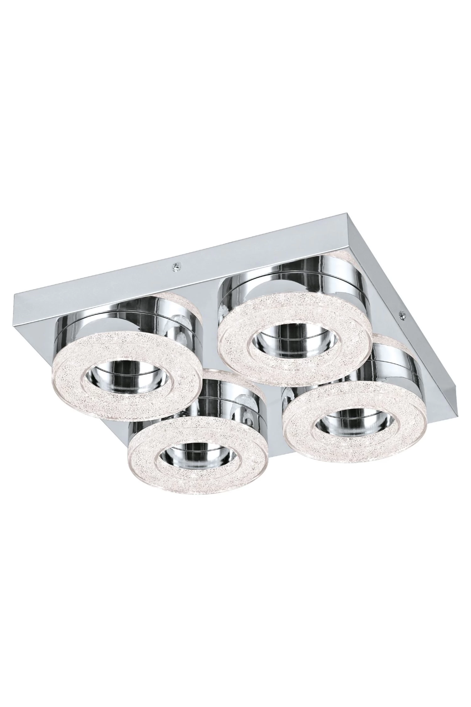 The Fradelo is a contemporary fitting that can be used as a wall or ceiling light. The product has a square base in polished chrome with four rings. The fitting has integrated LED components that produce a warm white light and highlights the crystal detailing on the rings when illuminated to add a touch of sparkle to your home. This light is IP20 rated, suitable for interior use only. 5 year warranty.n