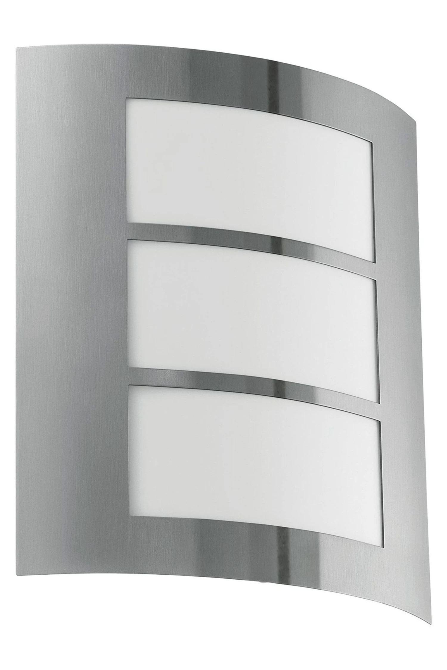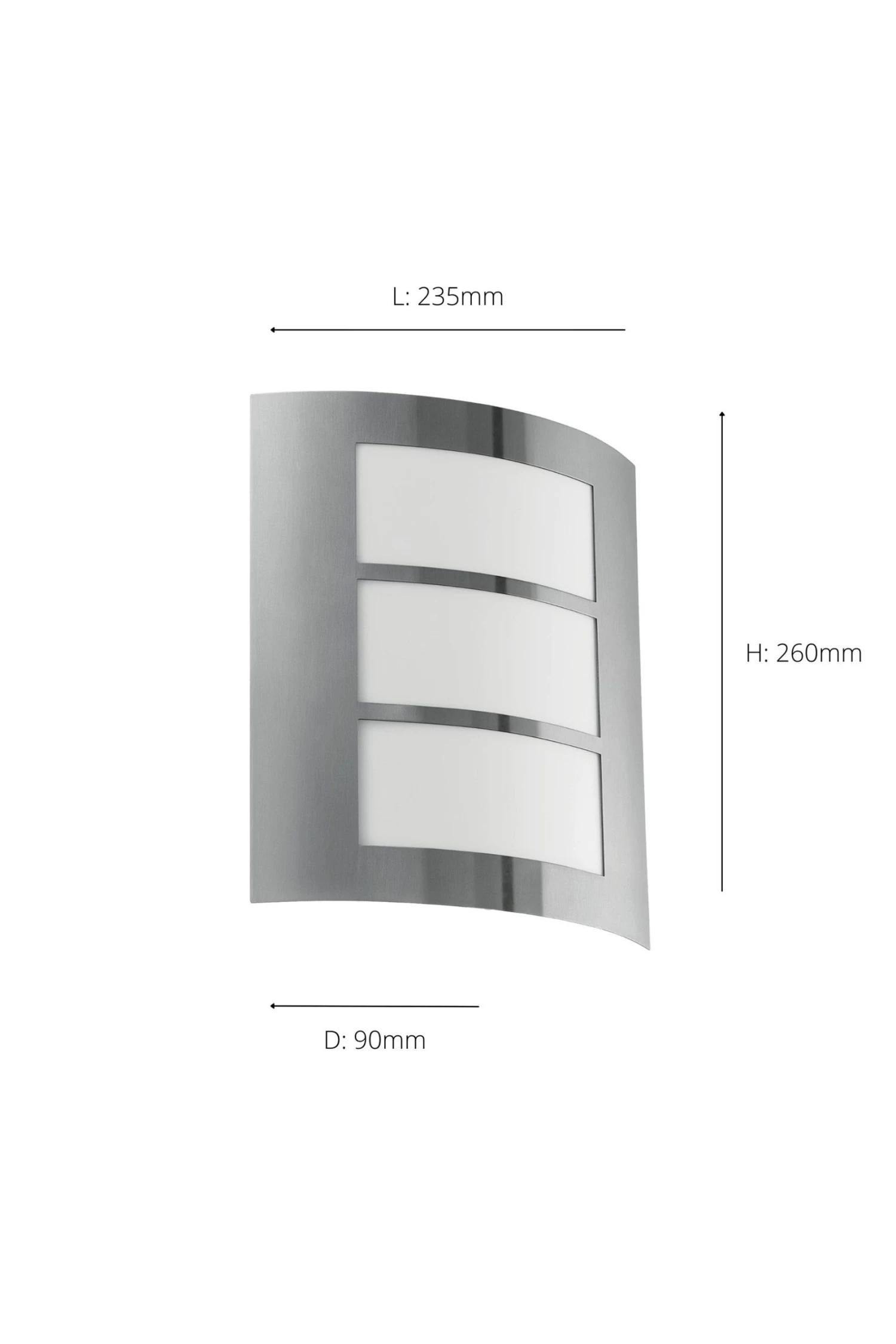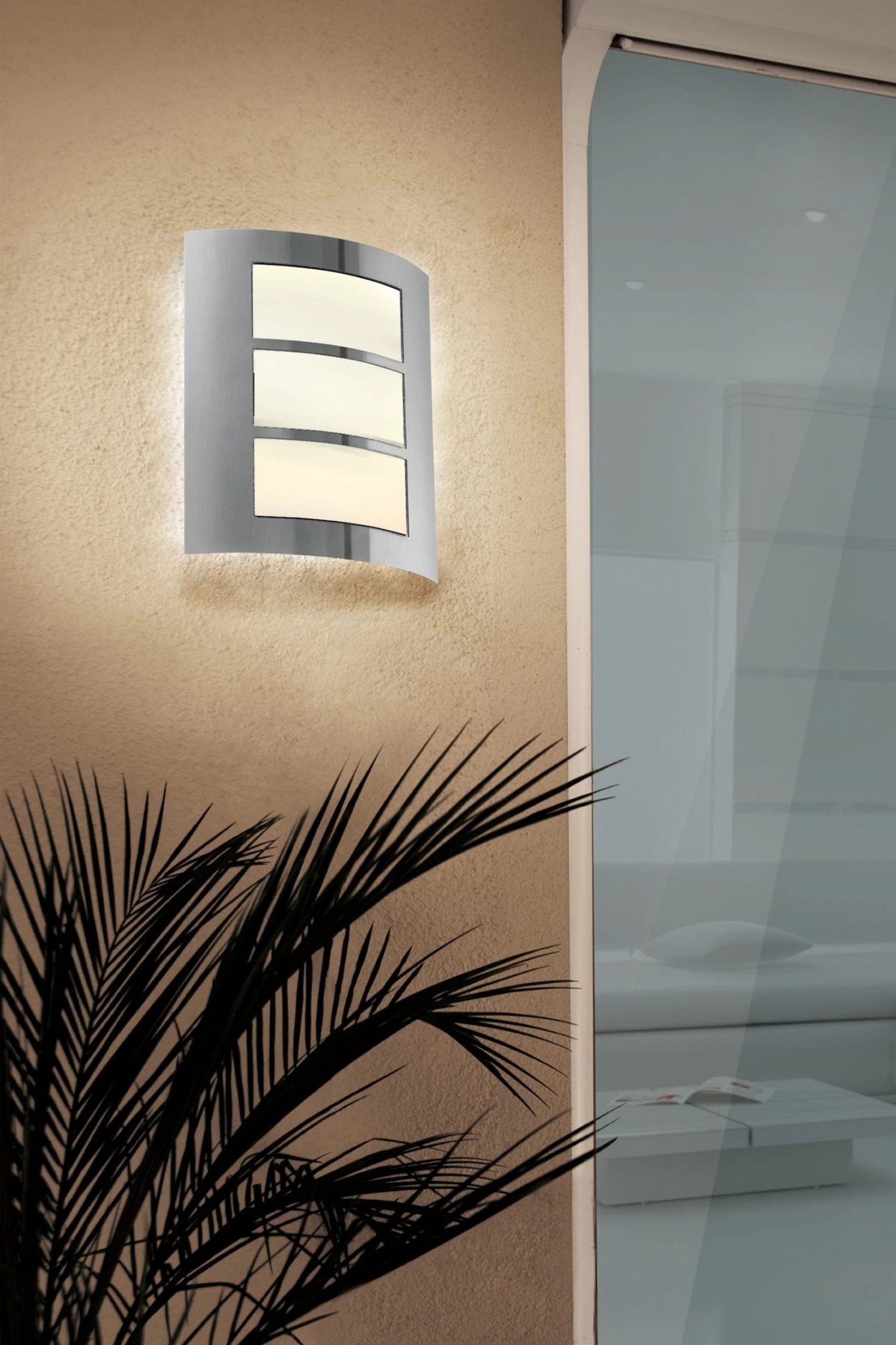 The City is a modern exterior wall light with a curved design and stainless steel finish with three white plastic diffuser elements. The product has an IP44 rating against spray water, ensuring it is suitable for outdoor use. The design is a sleek and contemporary look at exterior lighting and would complement a modern or minimalist exterior.