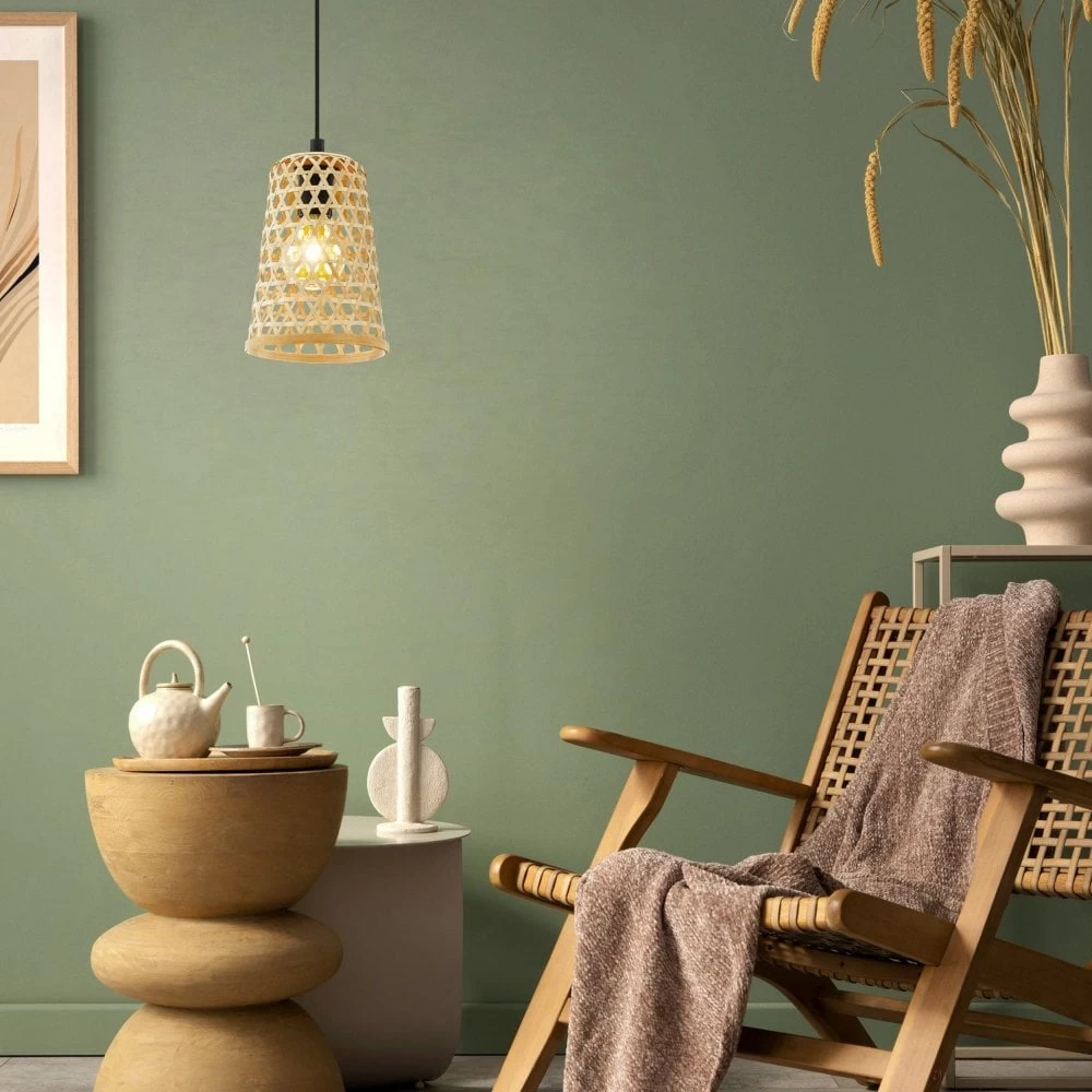 The CLAVERDON pendant light has a funnel-shaped lampshade made of natural rattan wicker paired with a black metal mount. The woven pattern on the lampshade creates a fascinating play of light and shadow as soon as the light is on. This pendant light blends seamlessly with trends such as natural, Scandi and boho, creating an appealing atmosphere with its natural materials