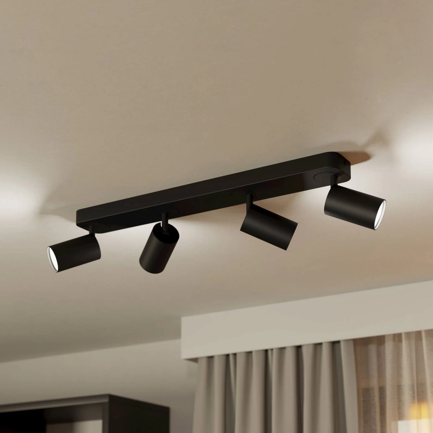Four-flame Telimbela-Z LED ceiling spot, smart controllableThe long Telimbela LED ceiling spot, equipped with a total of four movable spotlights, is made entirely of steel and comes with smart controllable light sources. Via the AwoX Home Control app, which is available free of charge for Android and iOS, a wide variety of settings can be conveniently made using a smartphone. Not only the selection of coloured light or white light in the range of 2,700 K to 6,500 K, but also dimming, the setting of light programmes or presence simulation is possible. The control of the luminaire via Bluetooth as well as ZigBee 3.0 also makes control via compatible voice assistants and the integration of the luminaire into compatible smart home systems possible.A further control option is offered by the remote control available as an accessory.features / compatibility:- controllable with the free AwoX HomeControl app – compatible with smart home systems from other manufacturers that use ZigBee 3.0- direct connection with Amazon Echo and Google Home possible- increased range thanks to additional Bluetooth Mesh- controllable with matching remote control even without internet access (see accessories)
