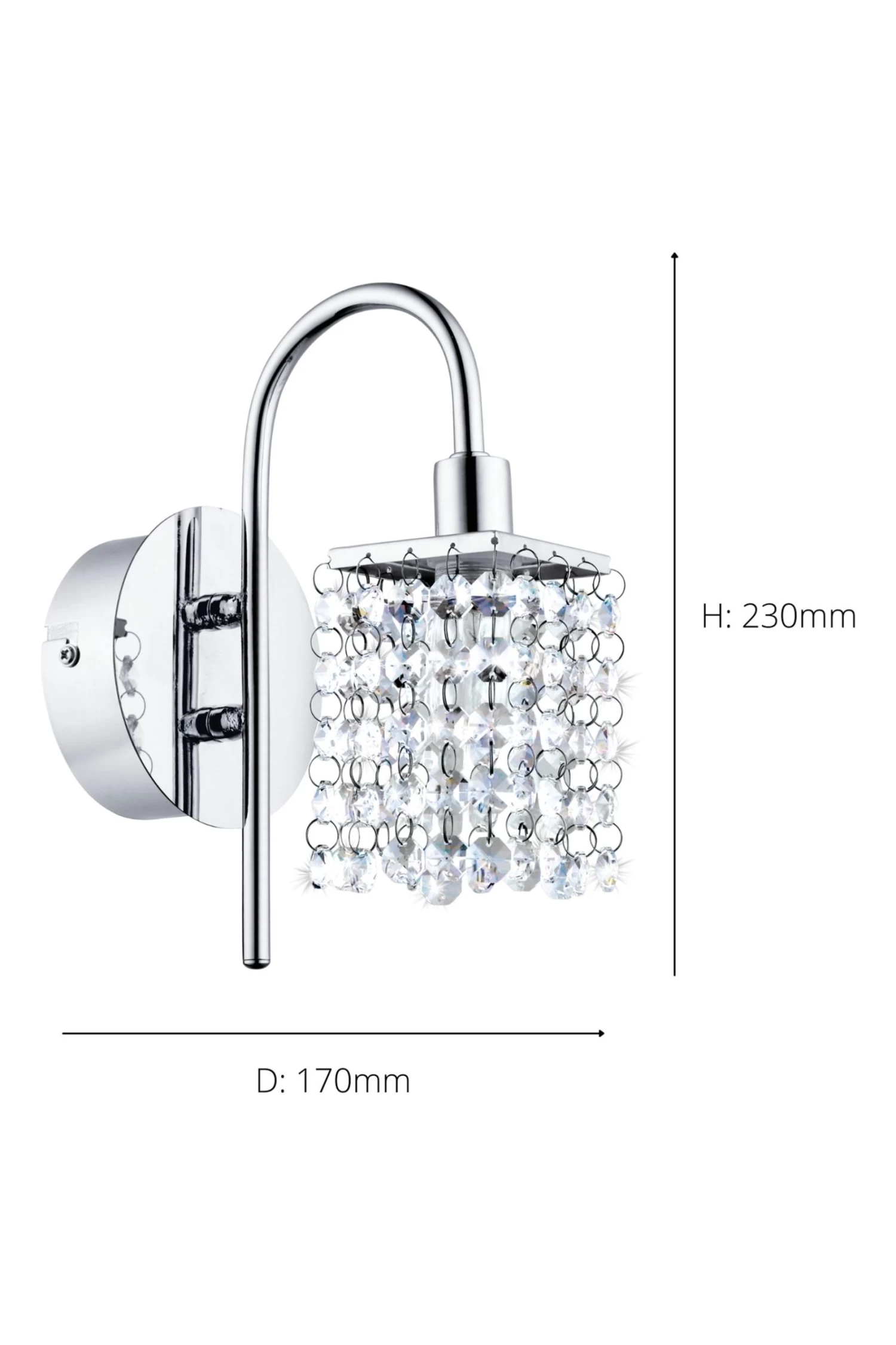 The Almonte is an eye-catching wall lamp with a circular base and slim, arched stem. The shade features a waterfall of crystals hung linearly which adds a touch of sparkle to any interior. The product has a contemporary polished chrome finish and includes a G9-LED illuminant which produces a pleasant warm white light when illuminated. The Almonte combines luxurious design with efficient illumination and an IP44 rating, meaning it is suitable for bathroom lighting. This light is IP44 rated, suitable for interior and bathroom use. 5 year warranty.