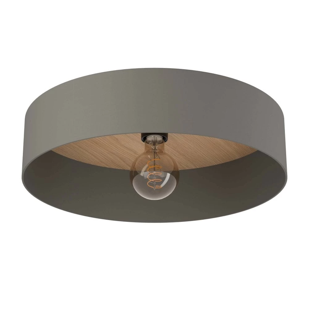 The Duaia ceiling light comes in either grey or taupe finishes. Custom the look with the reversible centre that has two finishes of brushed brass or wood look