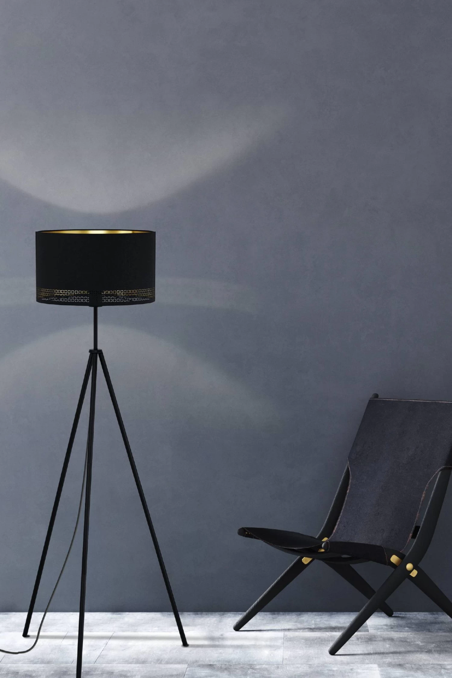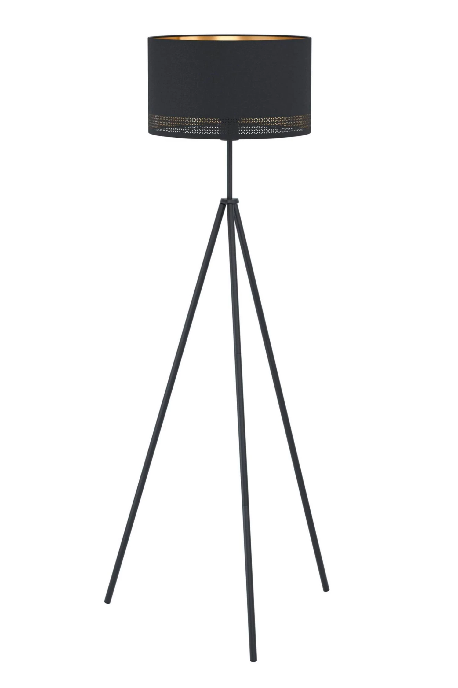 The Esteperra is a sleek floor lamp with a tripod design and black steel finish. The lamp has three slim legs and a fabric shade in a classic drum shape. The lampshade has an outer black finish and an inner gold finish, with a strip of cut-out design at the bottom of the lampshade. The lampshade creates a warm golden glow when illuminated as light reflects off the inside, and the cut-out design ensures an interesting light show on your walls. This style of floor lamp is versatile and fashionable and would be a great metallic accent to your home s interior. This light is IP20 rated, suitable for interior use only. Standard 2 year warranty.