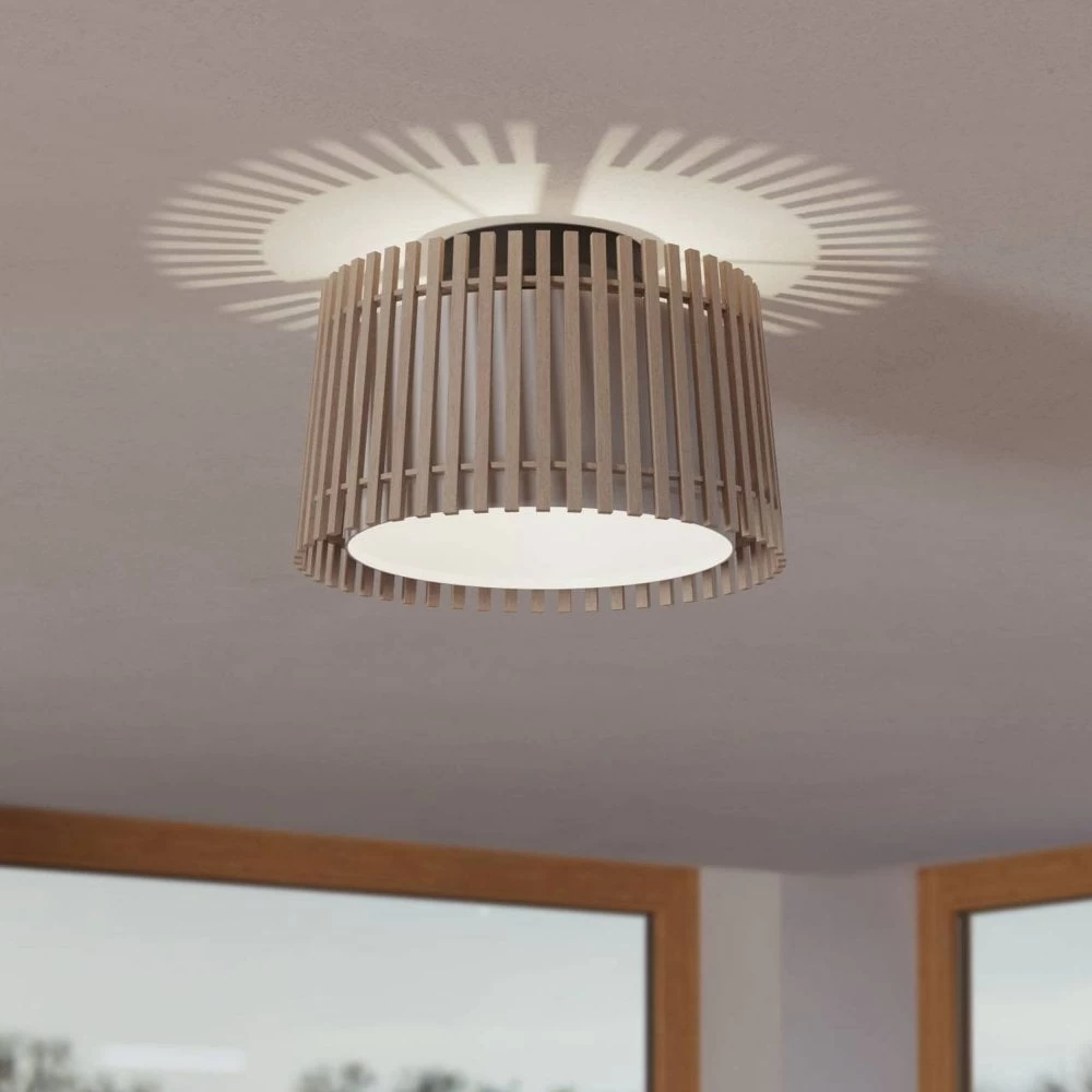 The Fattoria ceiling light features a lampshade made from light brown wooden segments and an inner white fabric diffuser that complements the light’s modern look. With a conical shape, the ceiling light blends seamlessly with any interior, providing cosy lighting in the kitchen, bedroom, living room or hallway