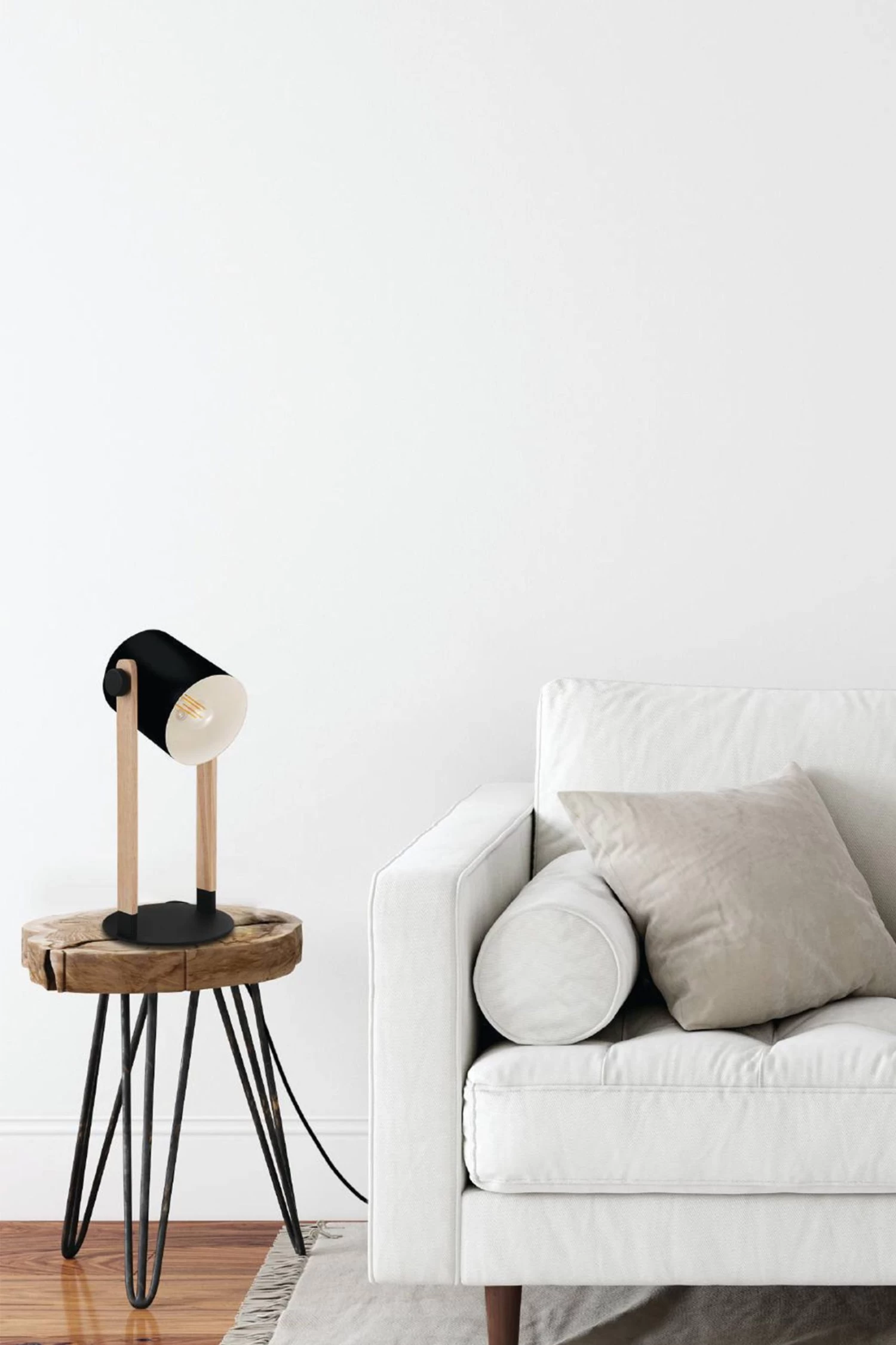 The Hornwood table lamp features a circular base with two wooden arms holding an adjustable cylindrical black steel shade. The lamp head can be adjusted and allows you to focus the light for your needs, perfect for reading a book or as desk lighting. This table lamp combines industrial elements and natural accents for a vintage charm, perfect for a bohemian or modern home.