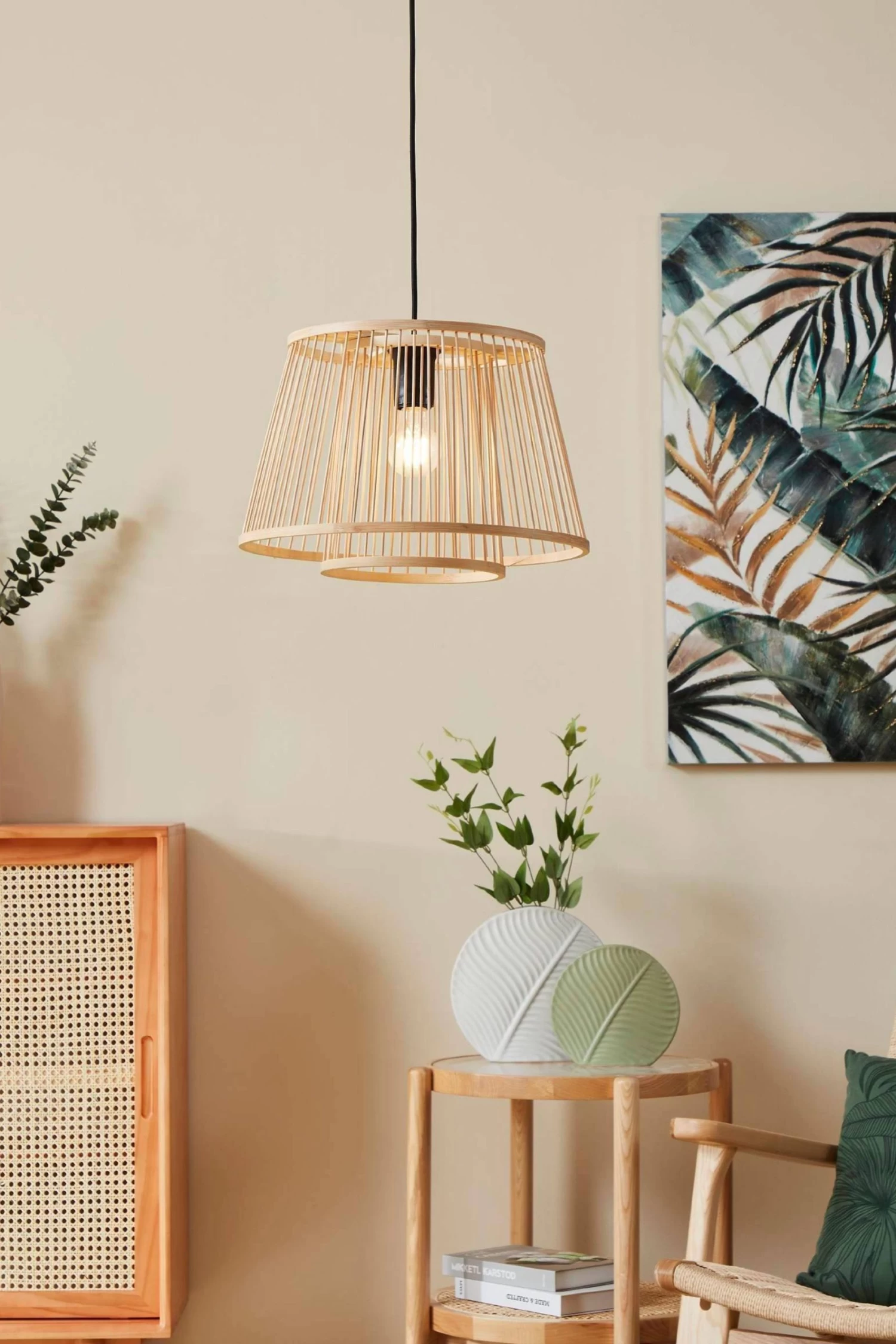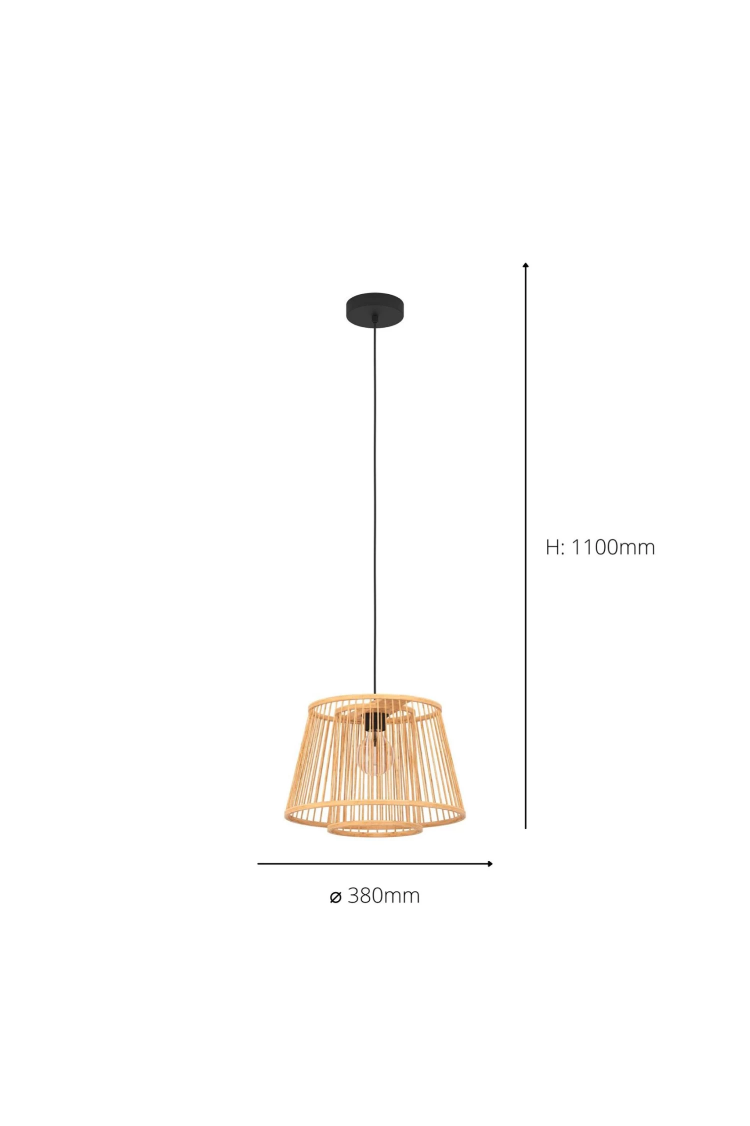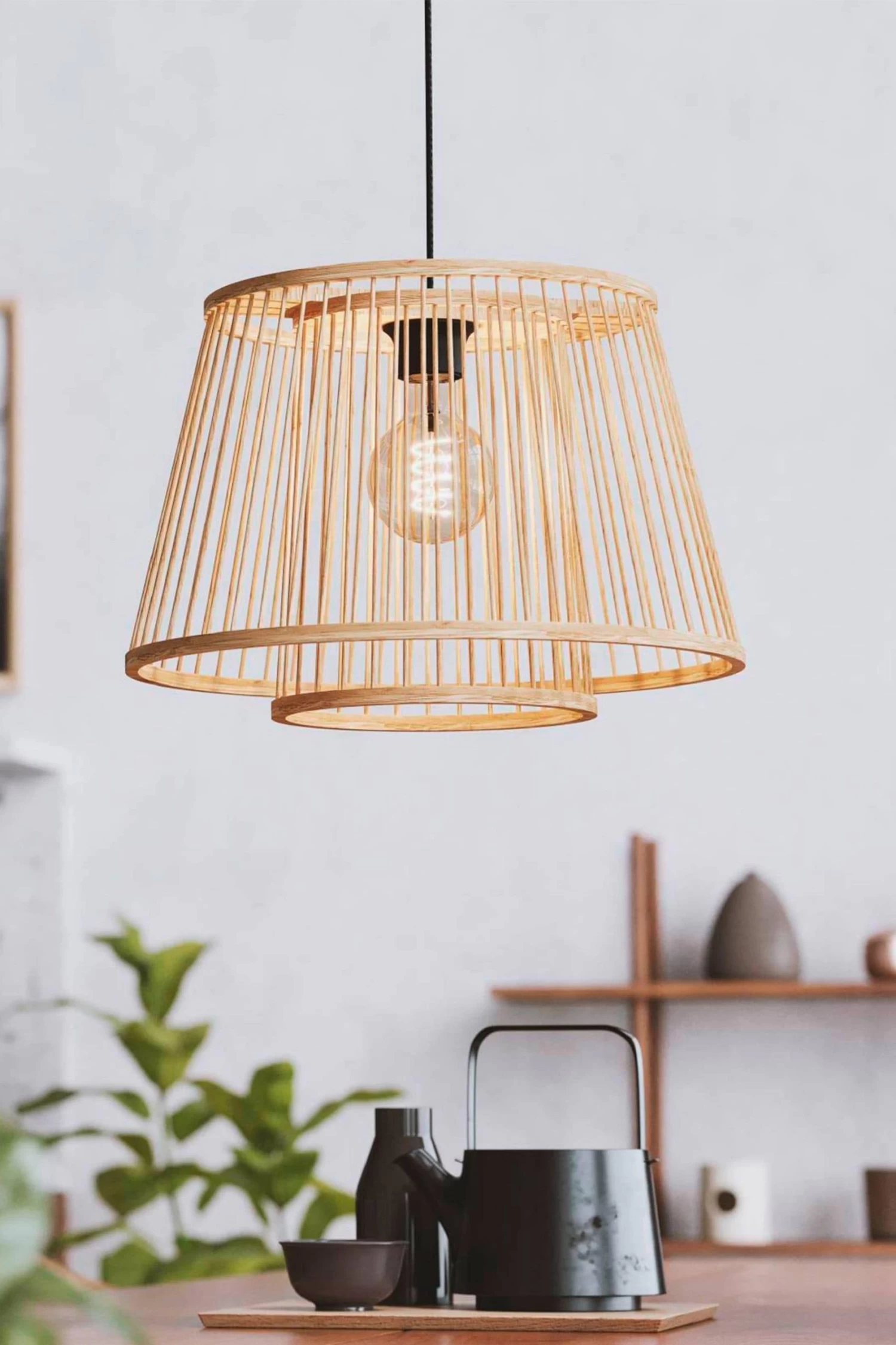 The Hykeham is a single pendant that adds a natural accent to your interior. The design has an inner and outer shade with a cut-out design and natural finish. The pendant has a semi-visible lightbulb style and casts beautiful light and shadows once illuminated due to its caged design. The pendant light complements a range of interior styles from boho chic to modern and is the perfect choice for dining room or kitchen lighting. The product may differ in colour due to natural variation from the wooden finish.