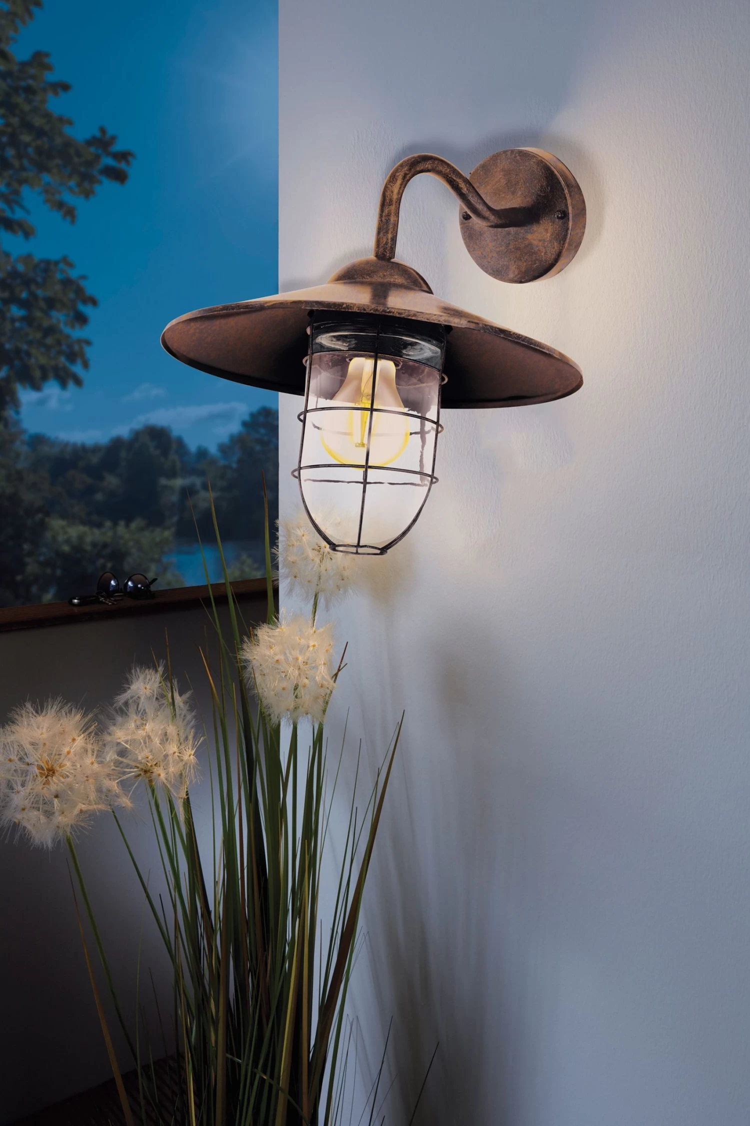 The Melgoa draws from traditional designs to create a beautiful choice for exterior lighting. The product has a circular base with a curved arm and a flat bistro-style shade. The product has an antique-style copper-coloured finish in zinc-plated steel and has a cylindrical clear glass shade that has copper caged detailing around it. The product can be corner mounted and has an IP44 rating. The Melgoa requires 1 x E27 illuminant and would compliment a retro-style lightbulb to enhance this antique style. This light is IP44 rated, suitable for exterior use. Standard 2 year warranty.