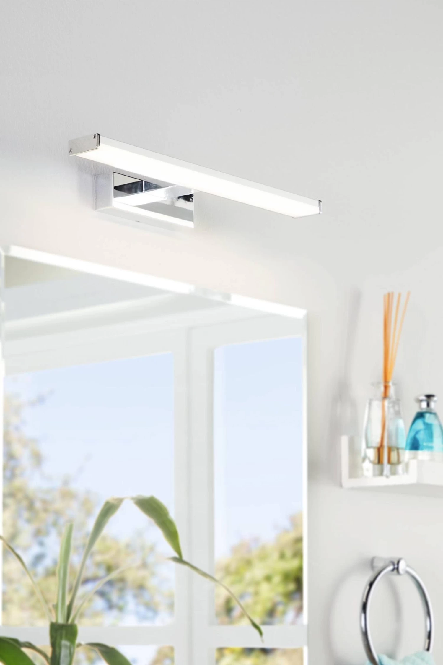 The Pandella 1 is a sleek mirror light with an IP44 rating and is perfect as bathroom mirror lighting. The fitting has a rectangular base and a slim bar design in chrome and silver plastic. The product has a white plastic diffuser with integrated non-replaceable LED components that produce a neutral white light when illuminated. The Pandella 1 offers optimal lighting for your bathroom with energy efficiency and a contemporary design.