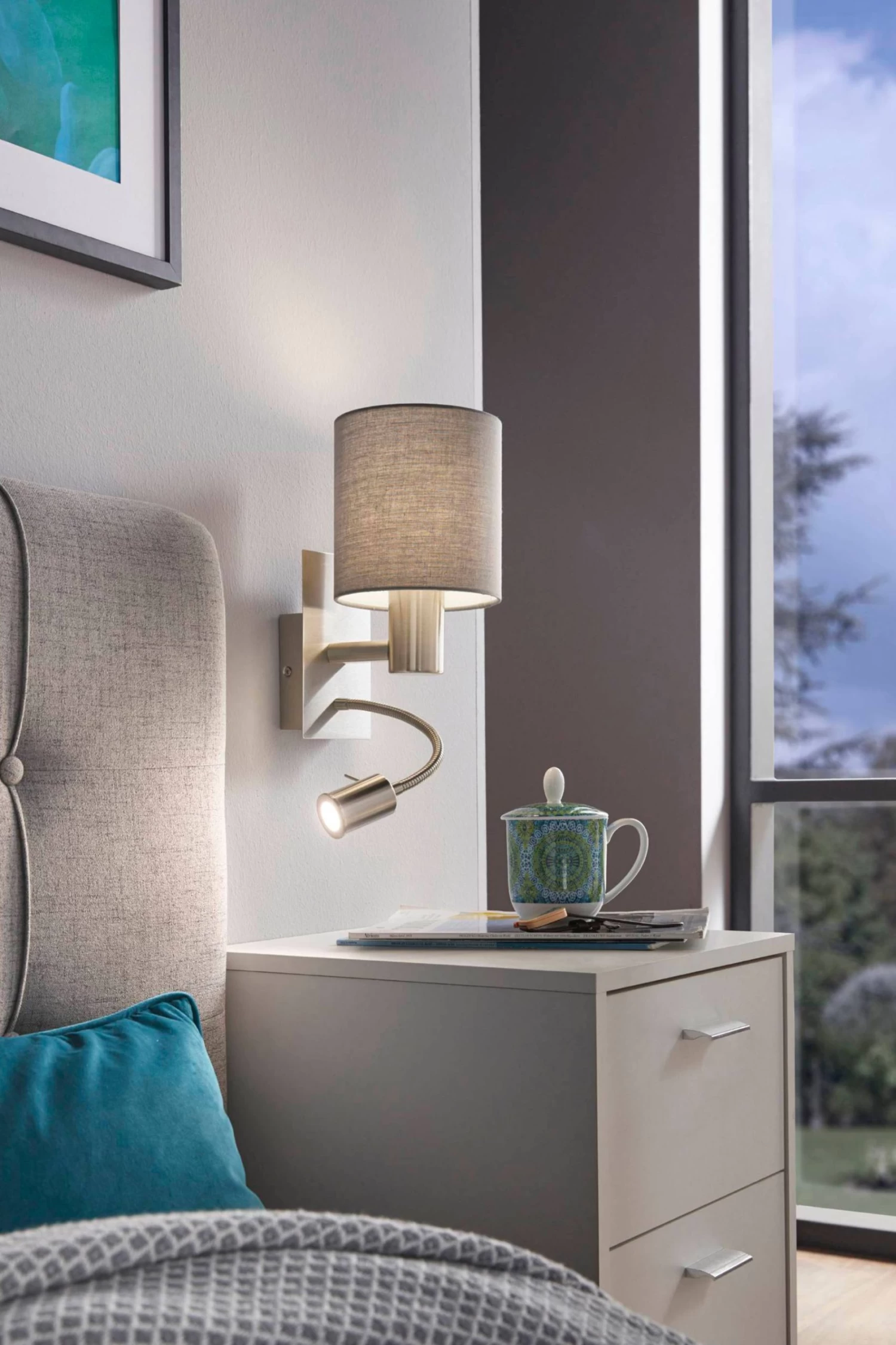 The Pasteri wall light brings a softer element into your home s styling. Featuring satin nickel detailing and a grey fabric shade, the Pasteri is a great way to add a textile element to your home. The Pasteri is a great way to illuminate a bedside table or reading nook, with its additional adjustable lamp to provide directional light where needed. The Pasteri is operated by a rocker switch and has integrated LED components for its additional lamp. This means that when illuminated, the lamp produces a warm white light which creates a warm and cosy atmosphere to read or unwind. This light is IP20 rated, suitable for interior use only. 5 year warranty.