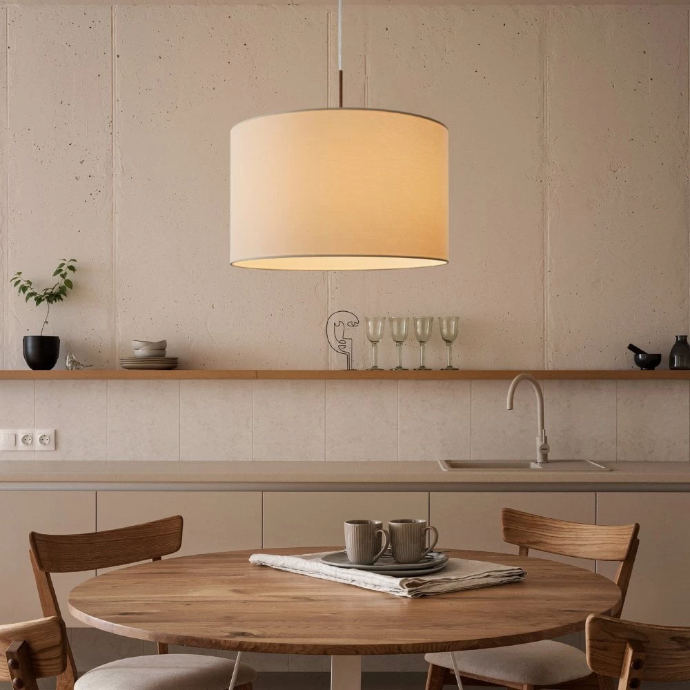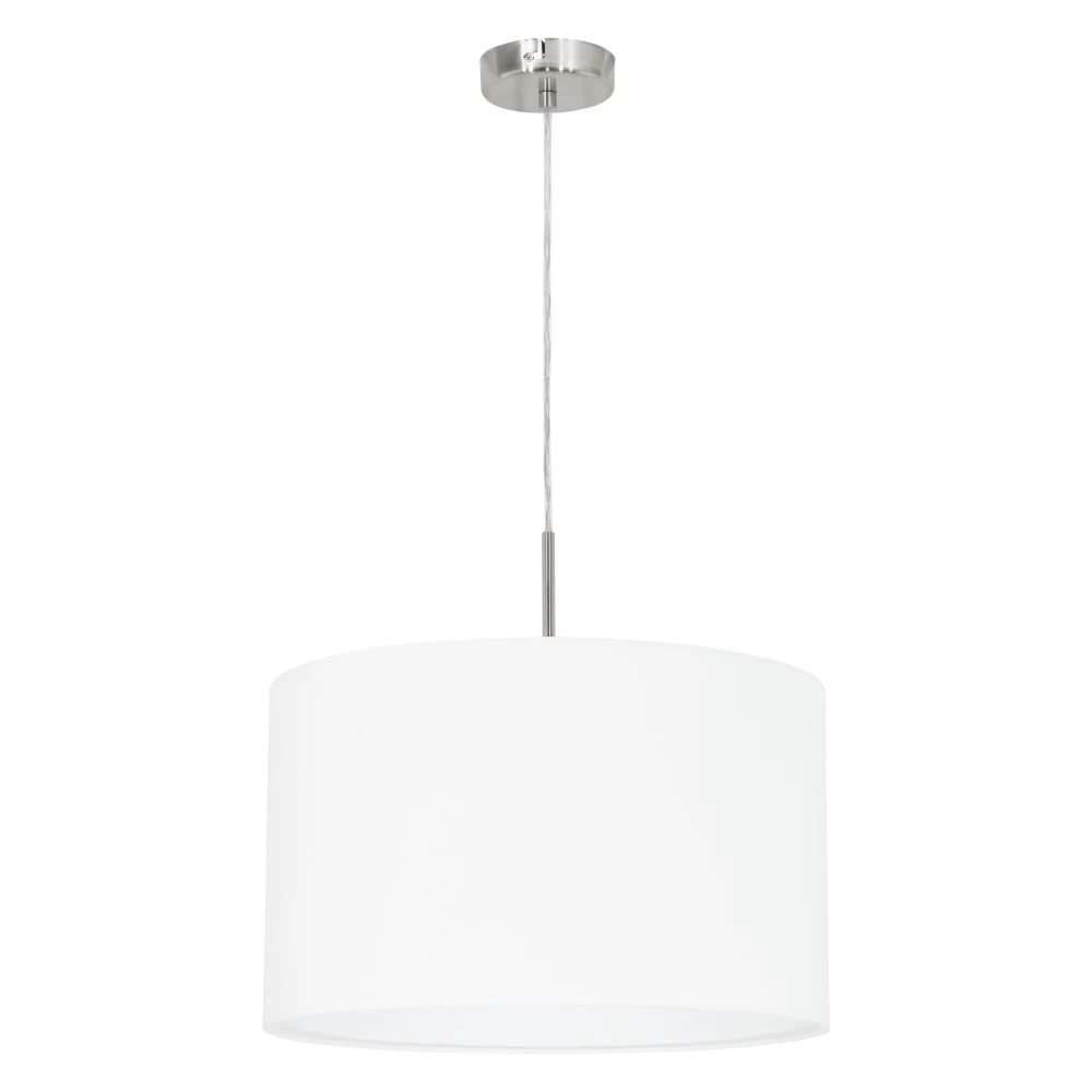 Pasteri small pendant light has a white matt fabric shade and white inner creating a simple and elegant design lighting solution with a sleek look satin nickel ceiling rose. The light fitting can be dimmed using a dimmable lamp and when fitting the light can be adjusted to the desired height