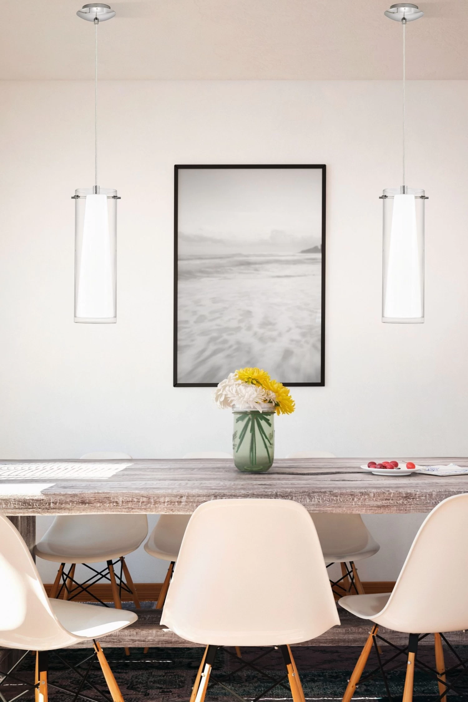The Pinto is a single pendant light with a simple and stylish design. The design has an outer cylindrical glass lampshade and an inner shade with a white opal-matte glass finish. The simple pendant light would complement a modern or contemporary home with its sleek style and classic white finish.