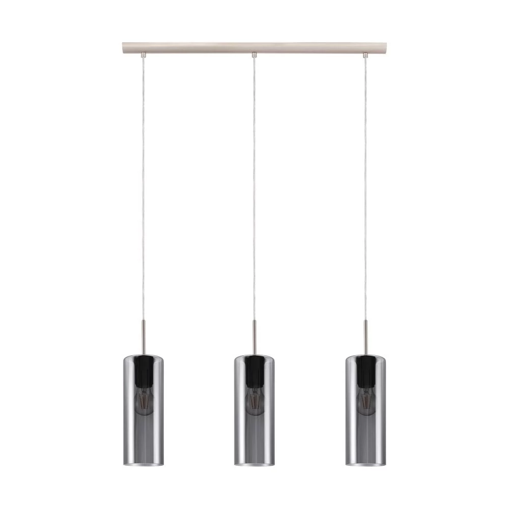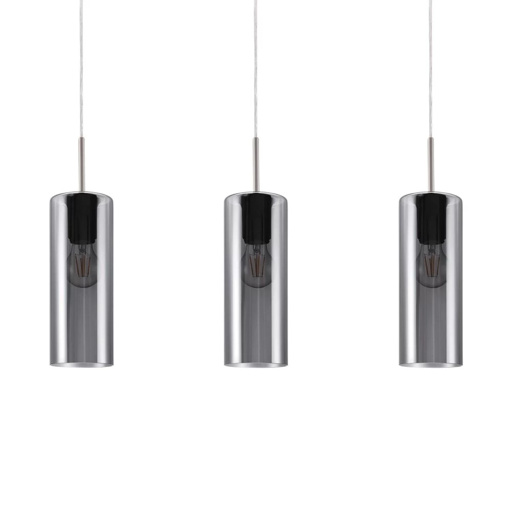 The SELVINO pendant light has three cylindrical smoked black glass lampshades suspended from a matte nickel canopy. The modern design works well with almost any interior style and will create the right mood in any space, whether in the living room or over a long table in the dining room