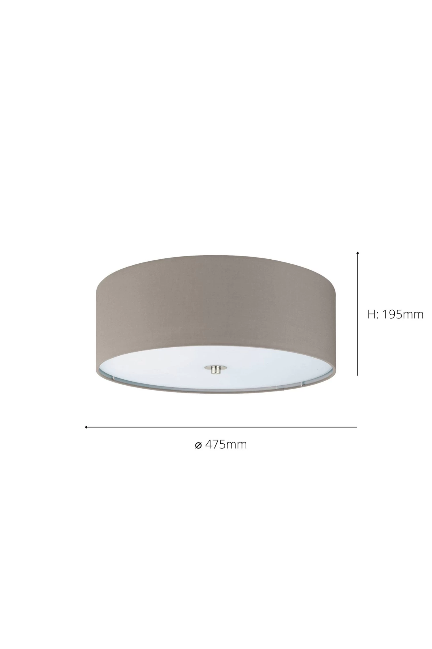 The Pasteri is a flush ceiling light with a classic taupe finish. The fitting has satin nickel detailing with a taupe fabric shade and a glass diffuser. The Pasteri requires 3 x E27 lightbulbs and would work well in homes or offices with lower ceilings due to its compact design. With its taupe finish, the Pasteri would complement a range of interior styles or rooms due to its versatility and simple design. This light is IP20 rated, suitable for interior use only. Standard 2 year warranty.