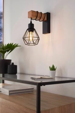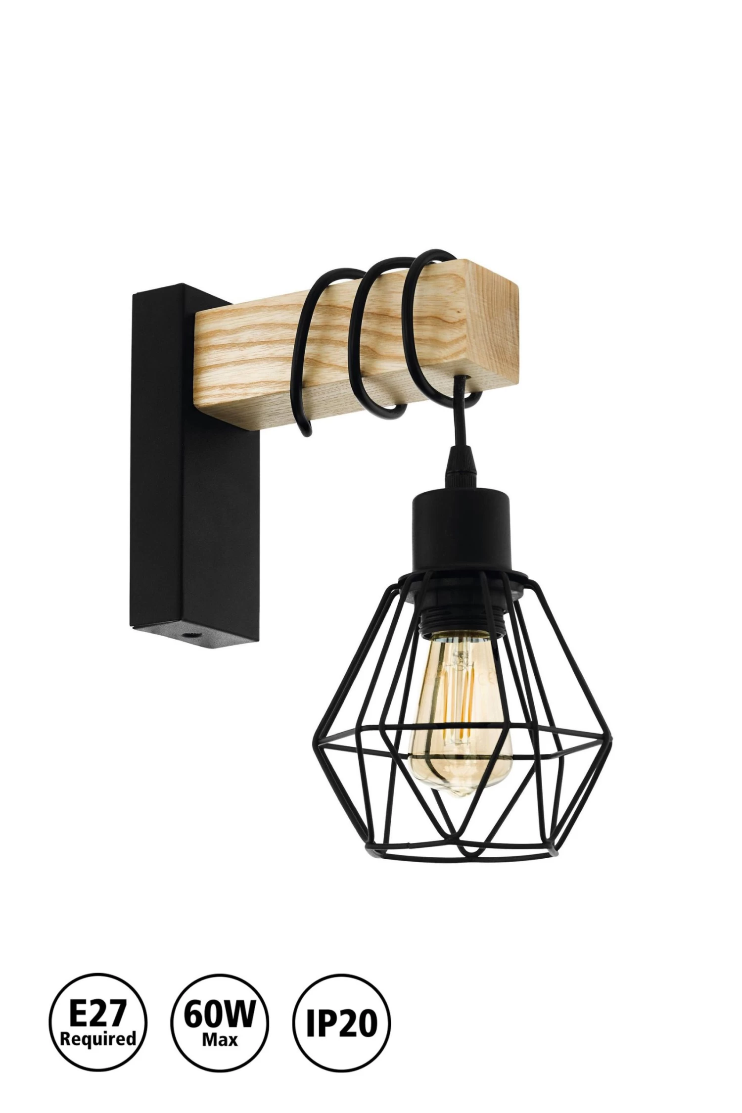 The Townshend 5 is a wall lamp with a rectangular black steel base and rustic wooden bar. The bar has a lamp holder draped across, evoking industrial and retro charm. The product has a caged shade in black wire-style steel and visible lightbulb style. Consider a retro-style illuminant for an extra drama to this fitting. This light is IP20 rated, suitable for interior use only. Standard 2 year warranty.