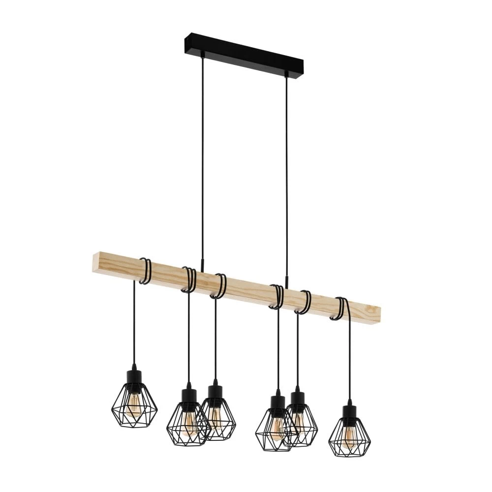 The TOWNSHEND 5 pendant light features a wooden beam with six black wire lampshades. These geometric metal frames have an adjustable height simply by winding or unwinding the cables. With a mix of pine wood and metal, the pendant light blends seamlessly with interior design trends, such as vintage and industrial. The pendant light provides modern lighting for any space, whether in the living room or over a long table in the dining room. The pictured filament lightbulbs are not included. The product has E27 lamp holders and requires E27 lightbulbs