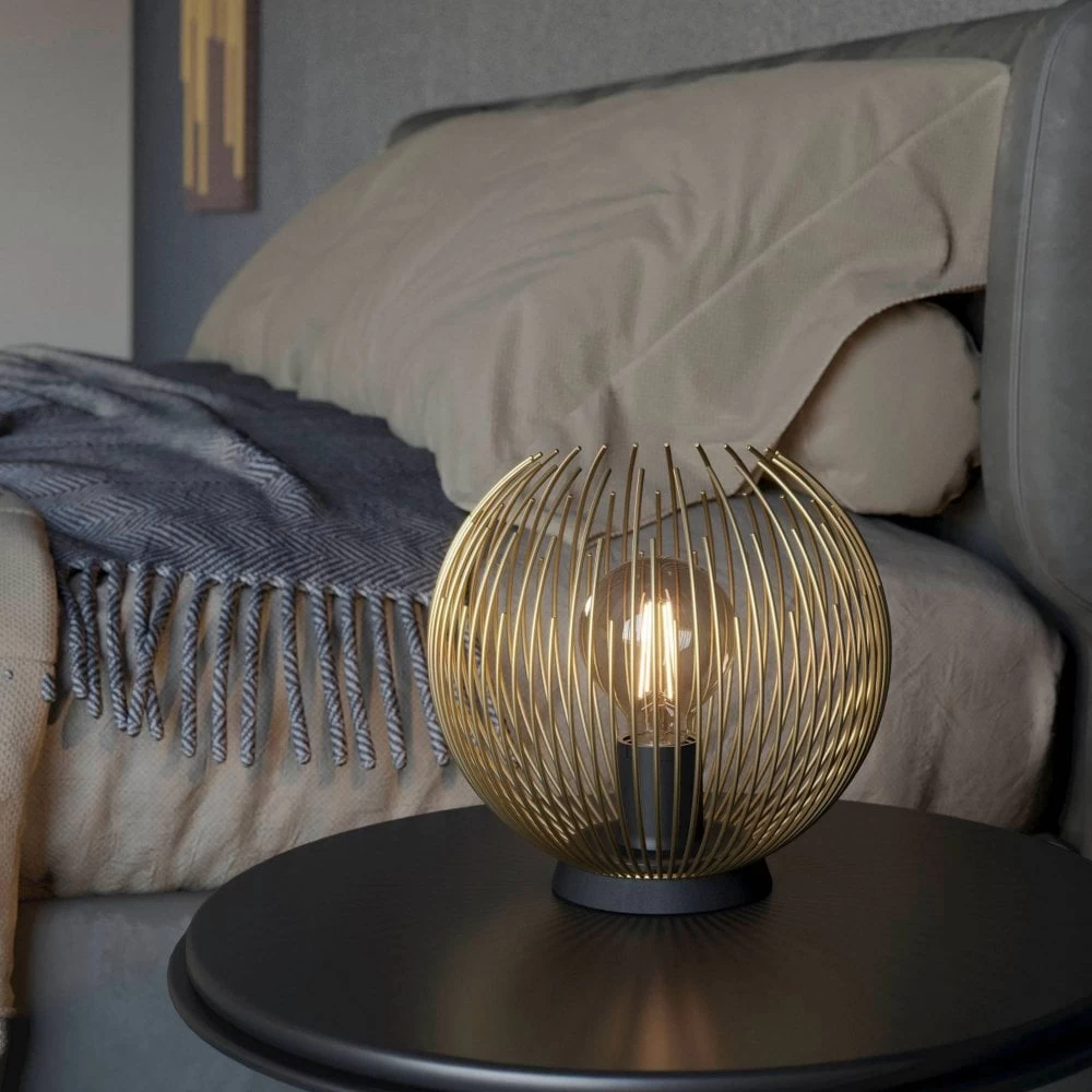 The VENEZUELA table lamp has a gold-coloured wire body and a round black metal base. The wire lampshade curves harmoniously around the lightbulb and creates a fascinating play of light and shadow as soon as the light is on. The table lamp can be switched on and off easily using the in-line switch and complements modern interiors. The product provides stylish lighting in any space, whether in the living room, bedroom or hallway